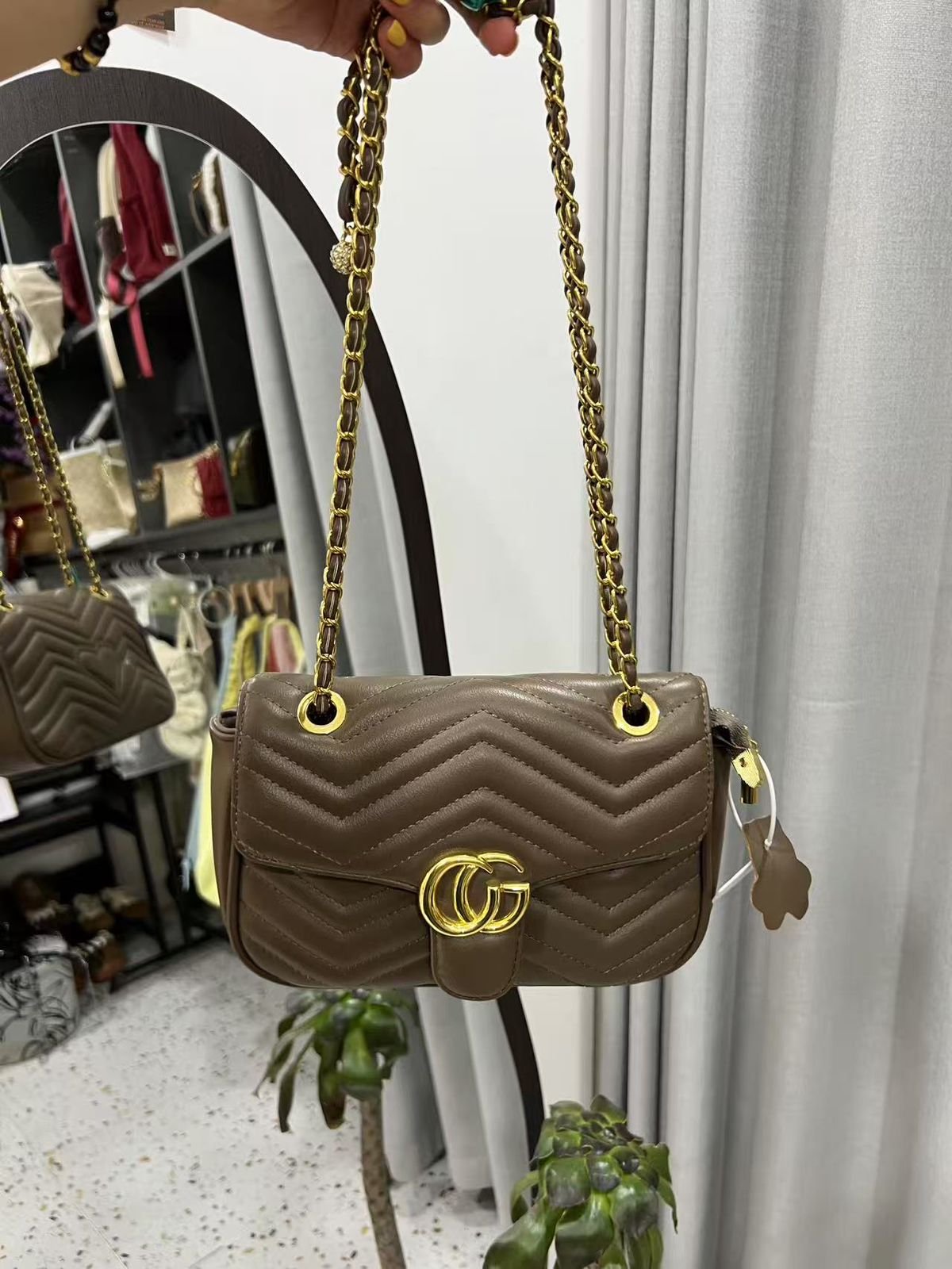 Material: Imitation leather; Bag style: Crossbody bag; Bag size: Small; Popular elements: Double G logo, chain shoulder strap, quilted design; Opening method: Flip cover; Hardness: Moderate; Brand: None (imitation Gucci style); Number of shoulder straps: Chain shoulder strap; Applicable scenarios: Daily, party; Style: Fashionable retro