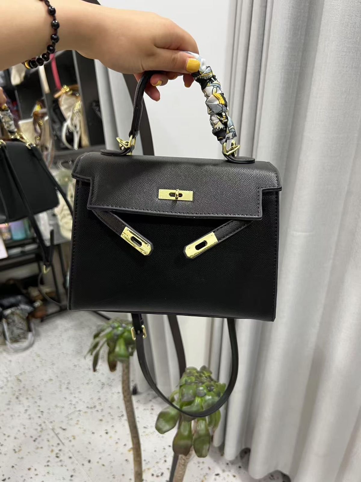 Material: Imitation leather; Bag style: Handbag and shoulder bag; Bag size: Medium; Popular elements: Classic Kelly bag shape, gold hardware buckle; Opening method: Flip lock; Hardness: Moderate; Brand: None (Imitation Hermès style); Number of shoulder straps: Single shoulder strap + hand strap; Applicable scenarios: Daily, commuting, dating; Style: Elegant and fashionable